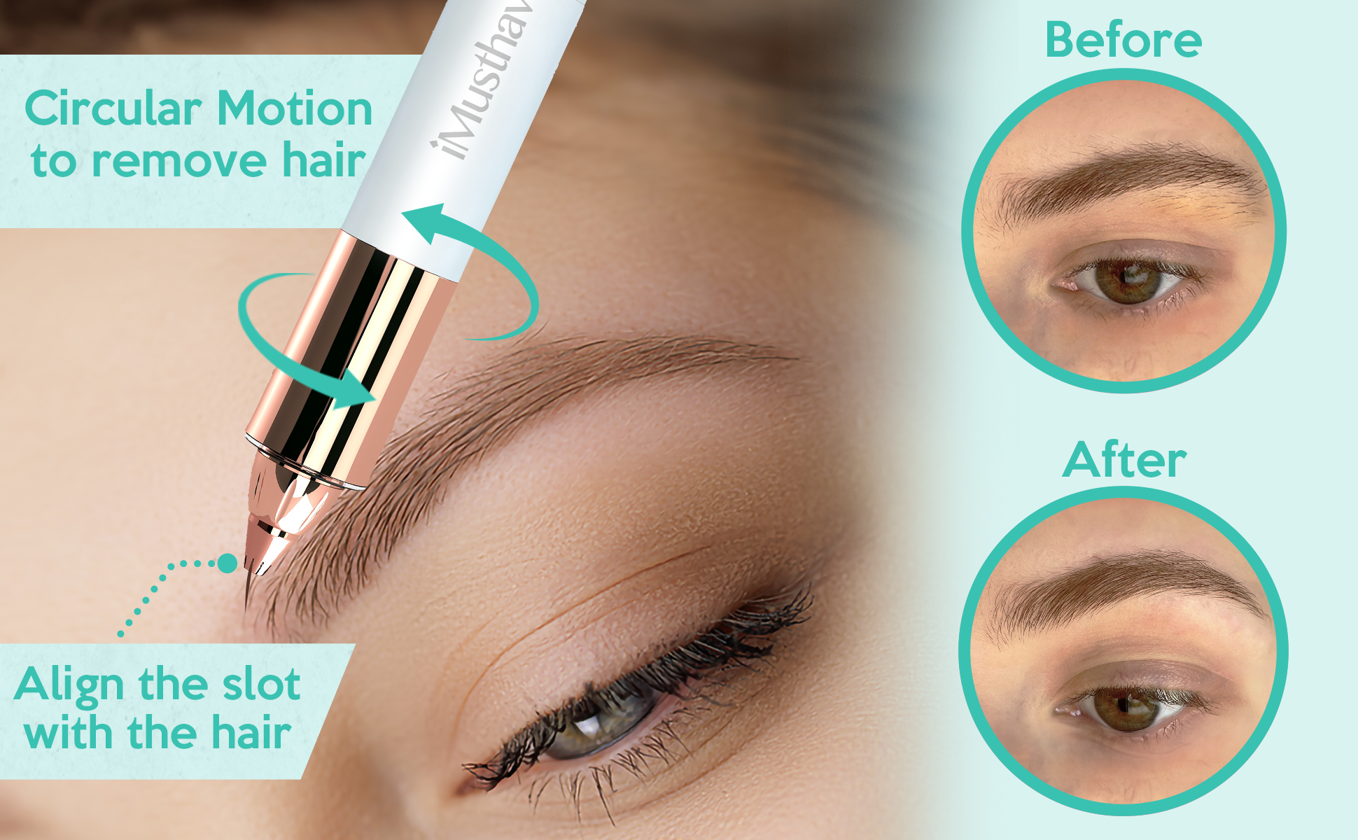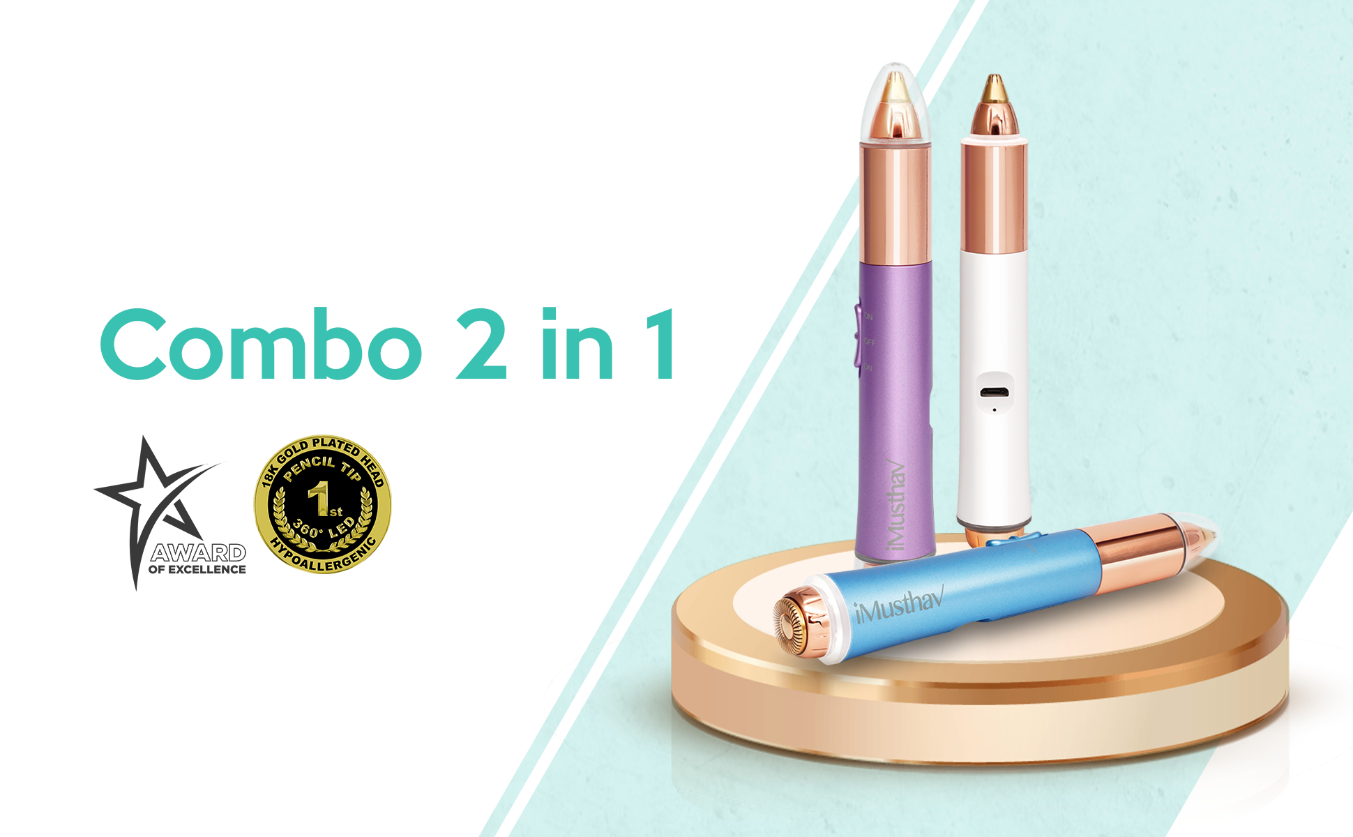 Our package includes the iMusthav 2-in-1 Portable Rechargeable Painless Eyebrow Trimmer & Facial Hair Remover, removes Eyebrow, face, Lips and Body Hair for Women. 18K Gold Plated Hypoallergenic Heads, 360° LED Light for Hair Removal, a USB-A to Micro-USB cable, and a cleaning brush.