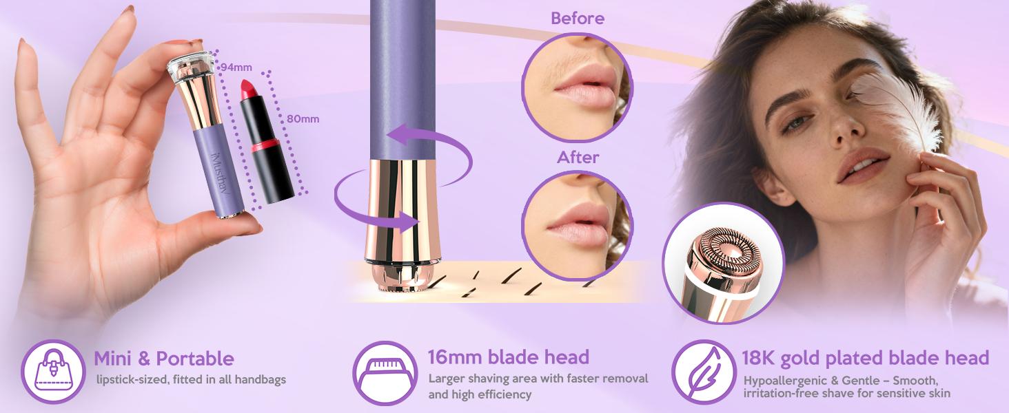 - 👜 Beauty meets practicality. Designed to resemble a sleek lipstick, the iMusthav Mini Facial Hair Remover combines fashion-forward aesthetics with functional brilliance. Its compact and discreet design slips effortlessly into any makeup bag or purse, making it the perfect companion for touch-ups—whether you're at home, at work, or on the move.